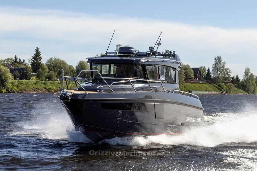 Самые мощные подвесники встречаются уже на 9,6-метровом «внедорожнике» с траулерной рубкой Grizzly 960 Unimog. Ему необходимо в общей сложности 900 л.с., и этого добиваются, установив либо пару двигателей по 450 л.с., либо три по 300 л.с.