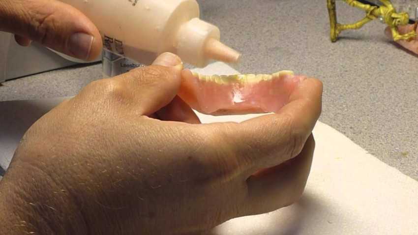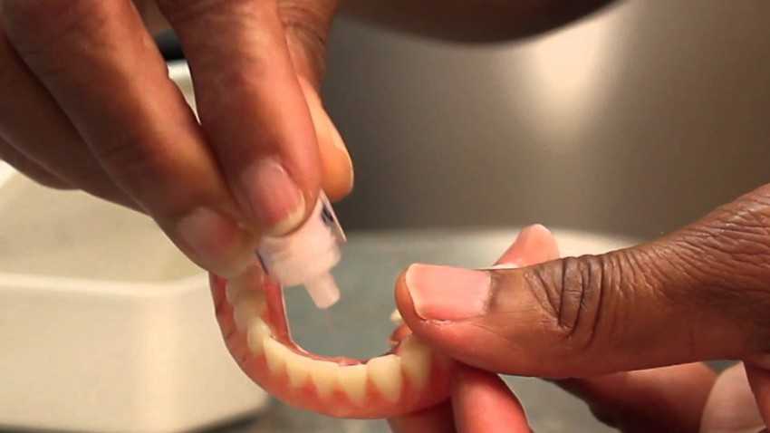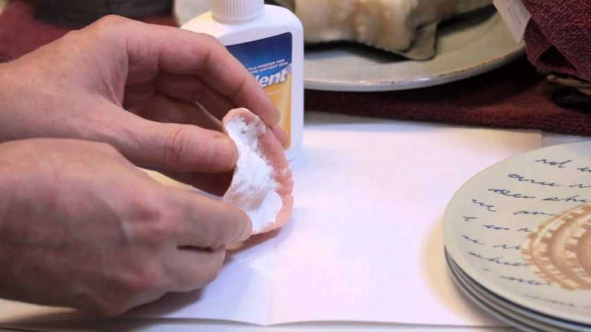 - Протез обязан быть сухим и чистым – перед нанесением препарата его необходимо очистить специальным средством или обычной пастой и насухо вытереть мягкой салфеткой.
