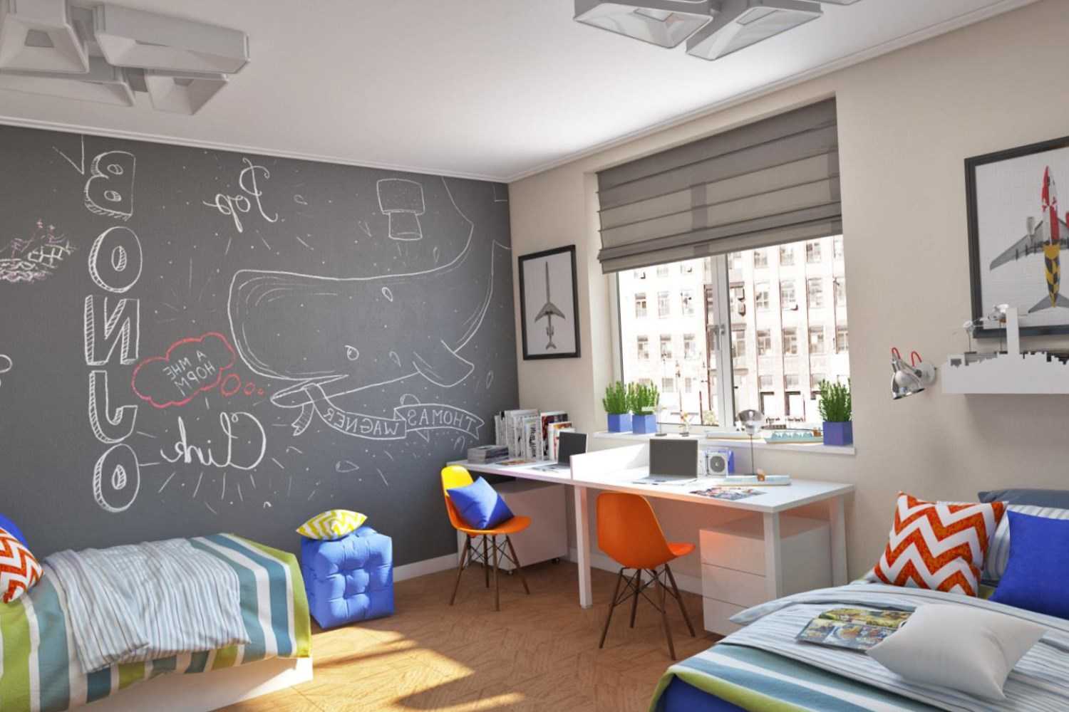 Для организации пространства для двух учеников придется постараться. Главное при этом — ни одного из детей не ущемить в плане справедливости распределения места. Для ребят примерно одного возраста и однополых делят его по принципу 50/50. Обоим одинаковые кровати, столы и стулья. Всего всем поровну, иначе дети будут постоянно соперничать, ругаться. В оформлении такого дизайна детской комнаты для школьников двухъярусная кровать станет идеальной. Это актуально для малогабаритного пространства.