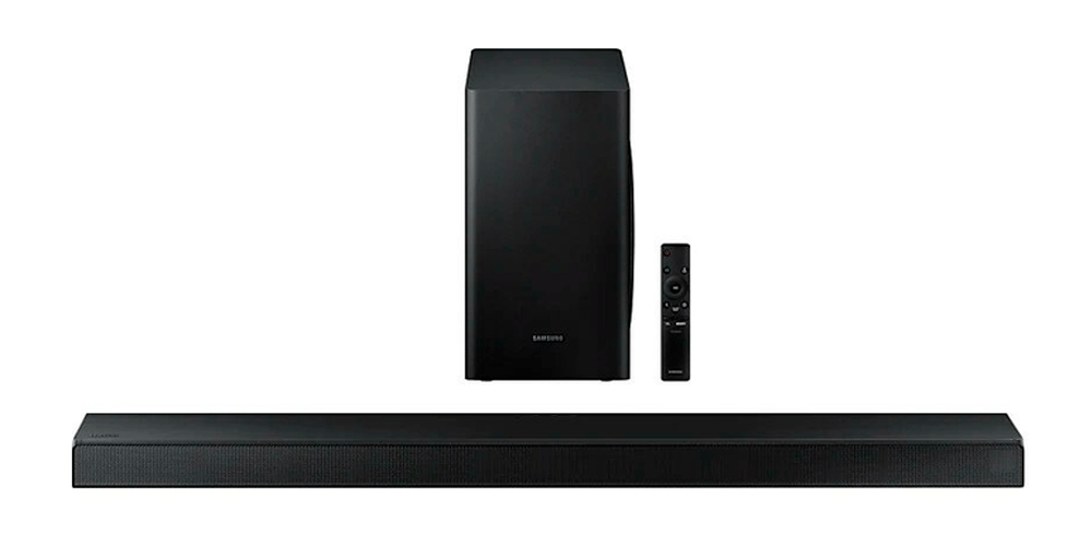 В шаге от бронзы топа саундбаров Самсунг для телевизора останавливается HW R450. Для прослушивания музыки модель подходит не так здорово, как дорогостоящие новинки (сказывается недостаток баса), но для игр и просмотра фильмов за свои деньги это практически идеальное решение. Диалоги слышно четко, при чем даже на минимальной громкости. Сабвуфер беспроводной, подключается по Bluetooth. Соединение поддерживается стабильно, не разрывается.
