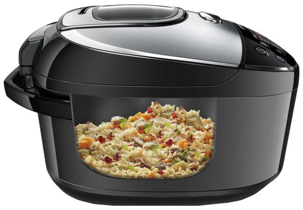 Среди достоинств мультиварки — керамическое покрытие пятилитровой чаши, окошко на крышке, позволяющее наблюдать за приготовлением, надежный пластиковый корпус с металлическими деталями и электронное управление. В комплекте вы найдете сетку для фритюра, щипцы, предназначенные для выемки чаши, и двойную емкость для приготовления на пару. Мощность — 900 Вт. Средняя цена — 9 900 рублей.