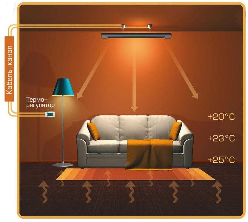 То есть, в помещении, где установлен инфракрасный обогреватель, сначала нагреваются предметы, а затем уже воздух – путем теплоотдачи от присутствующих объектов (подробнее о схеме действия — в статье принцип работы обогревателя с инфракрасным излучением).