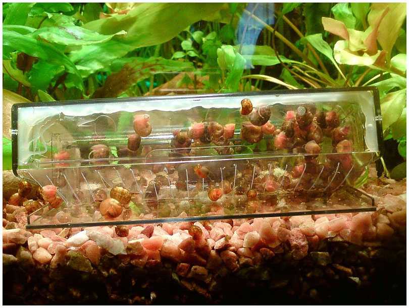 Очень часто в аквариуме численность улиток превышает желаемые показатели. Ручным способом выполнять чистку не только не удобно, но и не особо эффективно, учитывая, что после включения освещения они прячутся в укромные места. Поэтому если вы решили сделать аквариум своими руками, следует продумать и этот момент.