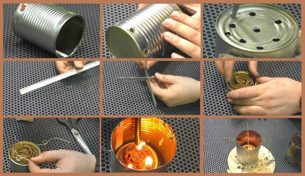 Компактный самодельный обогреватель готов. При использовании верхняя банка почти раскалена докрасна. Уходящего тепла более чем достаточно, чтобы обогреть небольшую палатку. Также можно использовать получившуюся конструкцию для приготовления. Для этого вместо верхней банки установите подставку из алюминиевых полос.