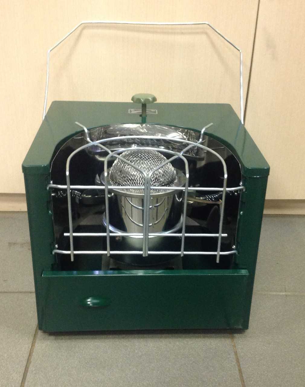 Простота прибора делает агрегат привлекательным для походных целей. Топка защищена прочной угловатой решеткой, рефлектор отражает часть тепла вперед, над горелкой согреете и сготовите пищу