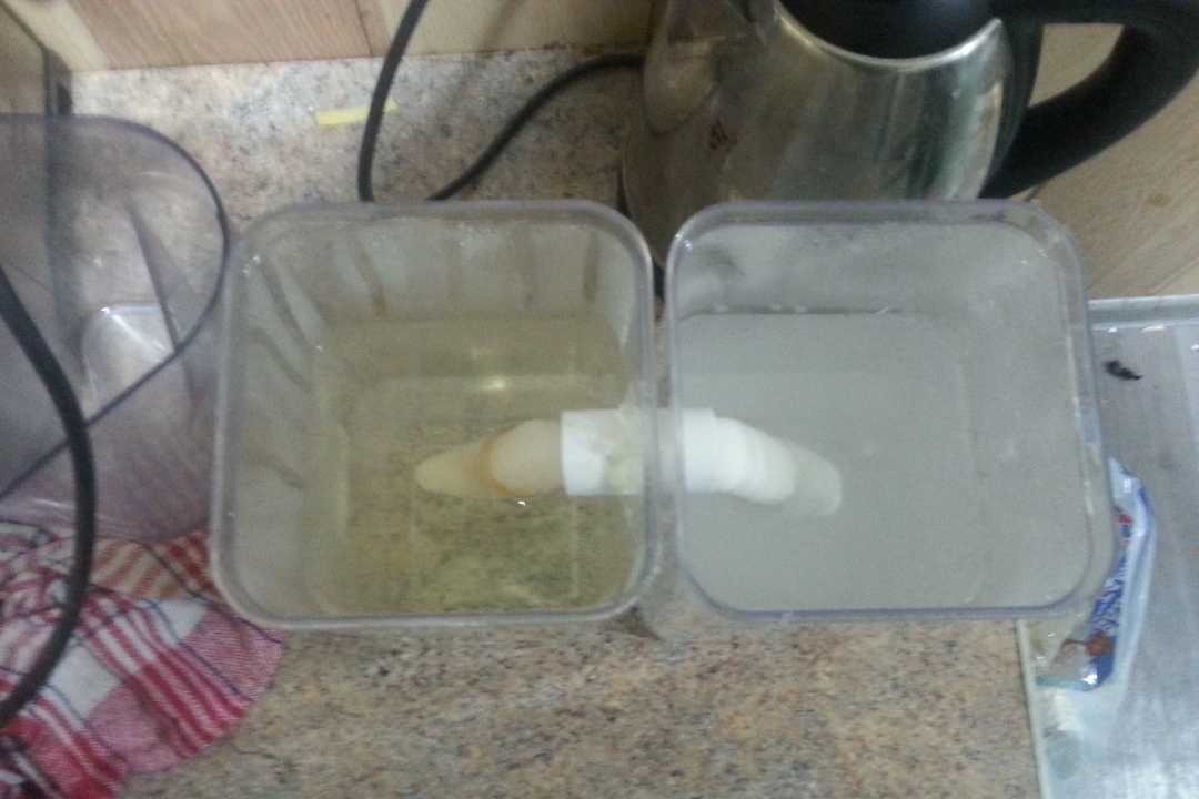 Следующий шаг – заполнение банок водой. Как я уже говорил, в каждую помещается около полутора литров. Воду желательно несколько часов отстоять, чтобы вышла большая часть хлора. Проверено – так качество воды на выходе после обработки становится лучше.