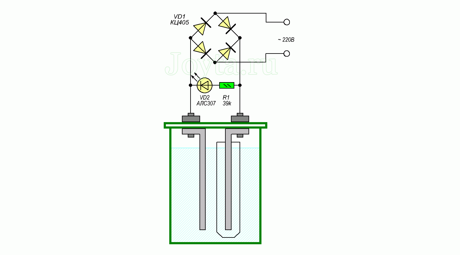 Сетевое напряжение, пройдя через диодный мост в виде постоянного напряжения, подается на электроды, которые помещены в банку с водой.Причем один из электродов (плюсовой электрод) необходимо поместить в мешочек из брезента, в котором так же должна быть налита вода. Впоследствии в нем будет образовываться «мертвая» вода, а в остальной банке «живая». Брезентовый мешочек можно сшить своими руками. Его размеры могут быть произвольными, лишь бы в него свободно входил электрод. Размеры можно взять такими: диаметр 7см, а высота около 20 см. банку можно использовать 800 мл или на 1л.