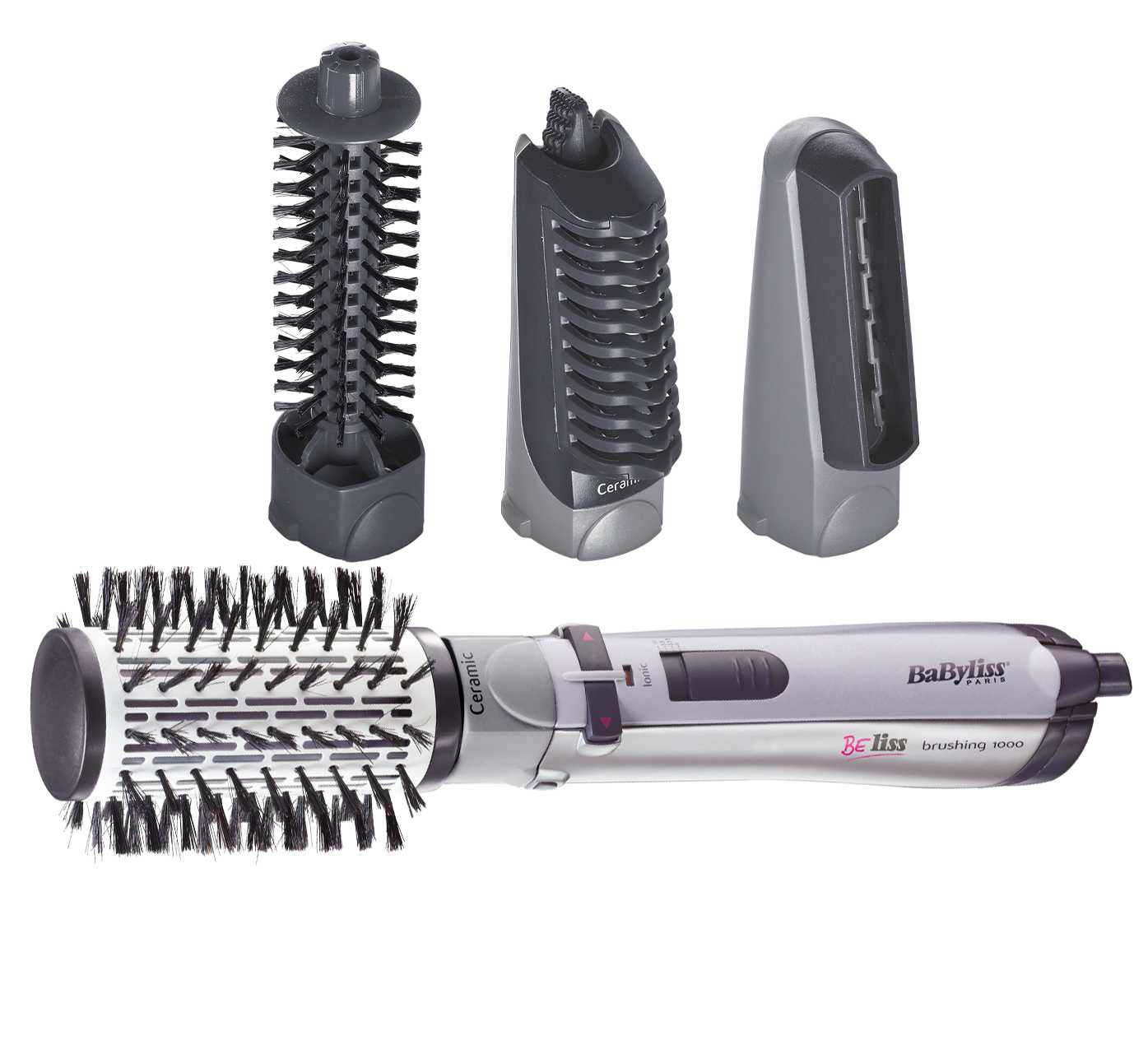 Мощность устройства достигает 1000 Вт. Дополнительно в нем производитель предусмотрел функцию подачи холодного воздуха и ионизации. Что касается температурных режимов, их тут всего три. Другие особенности модели фен-расчески: керамическое покрытие, автовращение насадок, 1.8-метровый провод подключения к сети, 2 насадки в комплекте.