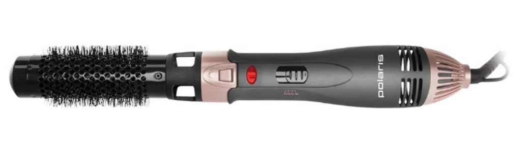 Этот прибор очень хорошо выпрямляет волосы благодаря высокой мощности. Пряди остаются гладкими за счет ионизации и не пересушиваются из-за наличия холодного воздуха. Фен-щетка укомплектована пятью насадками с керамическим покрытием. Вы можете регулировать не только температуру нагрева, но и воздушный поток. Длина шнура составляет 1.8 м.