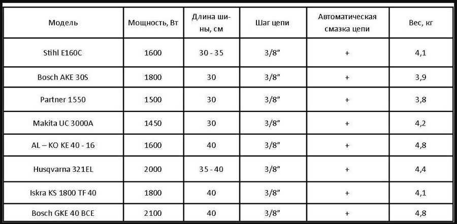 В левой колонке обозначены наиболее распространенные модели бензопил, в последующих – ведущие критерии. Отыскав нужную модификацию инструмента, можно в течение нескольких секунд узнать необходимые данные относительно ее пильной части и быстро разрешить любую спорную ситуацию.