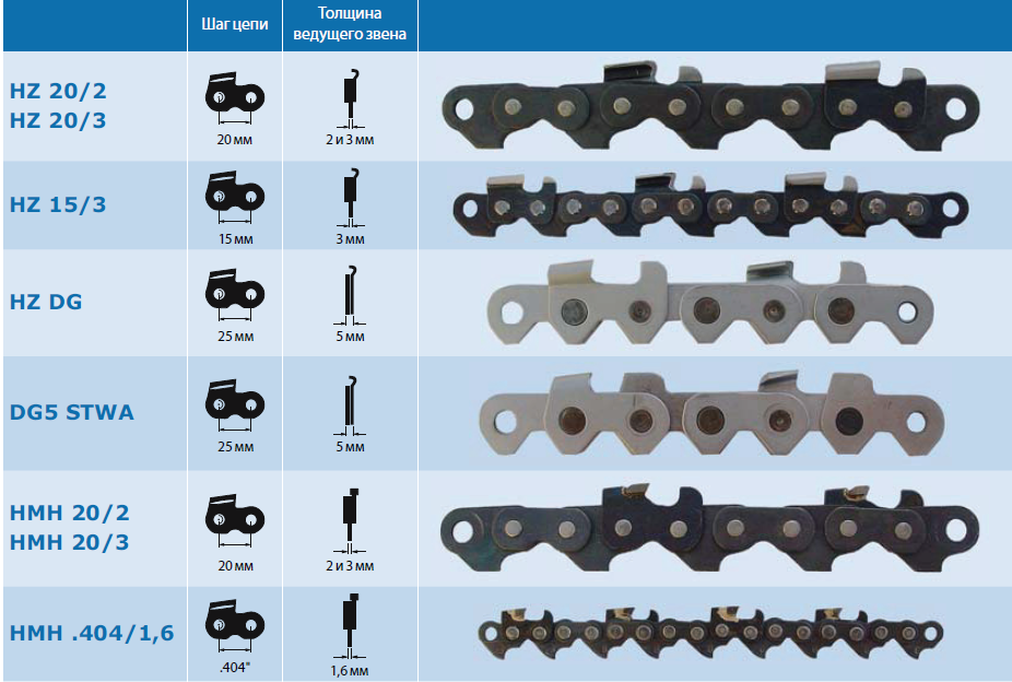 Мировые производители пильных цепей выпускают гарнитуры 5 основных типоразмеров: